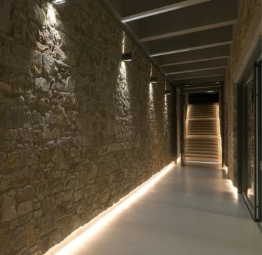 Halls, lavabos, paredes principais, fachadas e ambientes sensoriais.