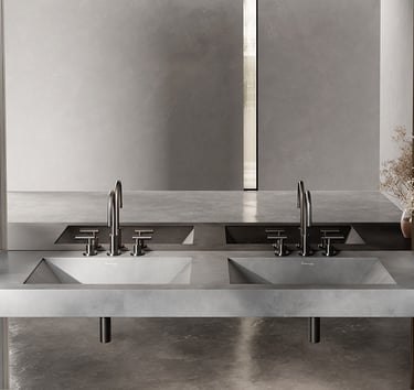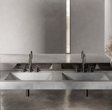 No banheiro de luxo, o concreto não reveste: ele constrói o espaço. Bancadas, cubas, painéis e volumes monolíticos deixam de ser elementos isolados e passam a formar uma arquitetura contínua, quase escultórica.